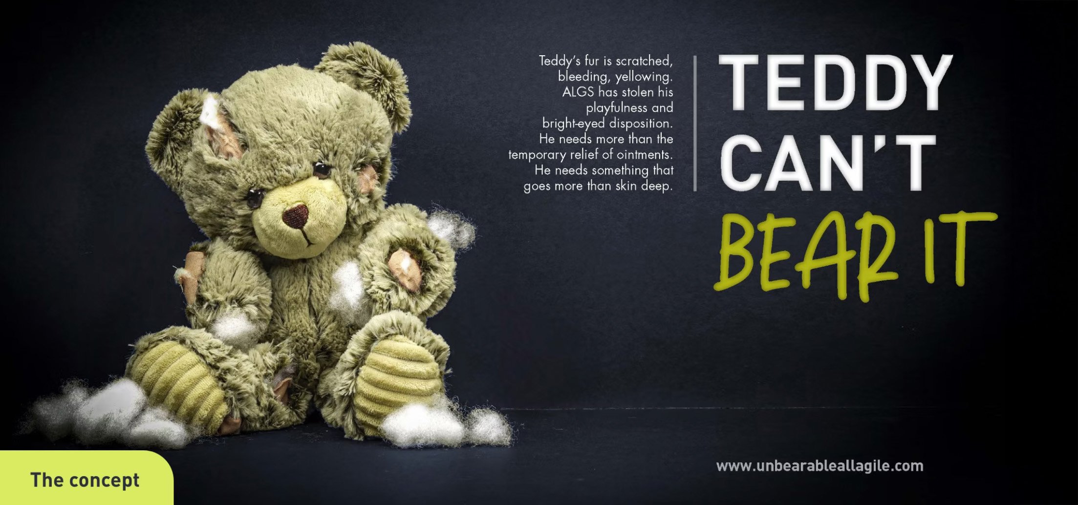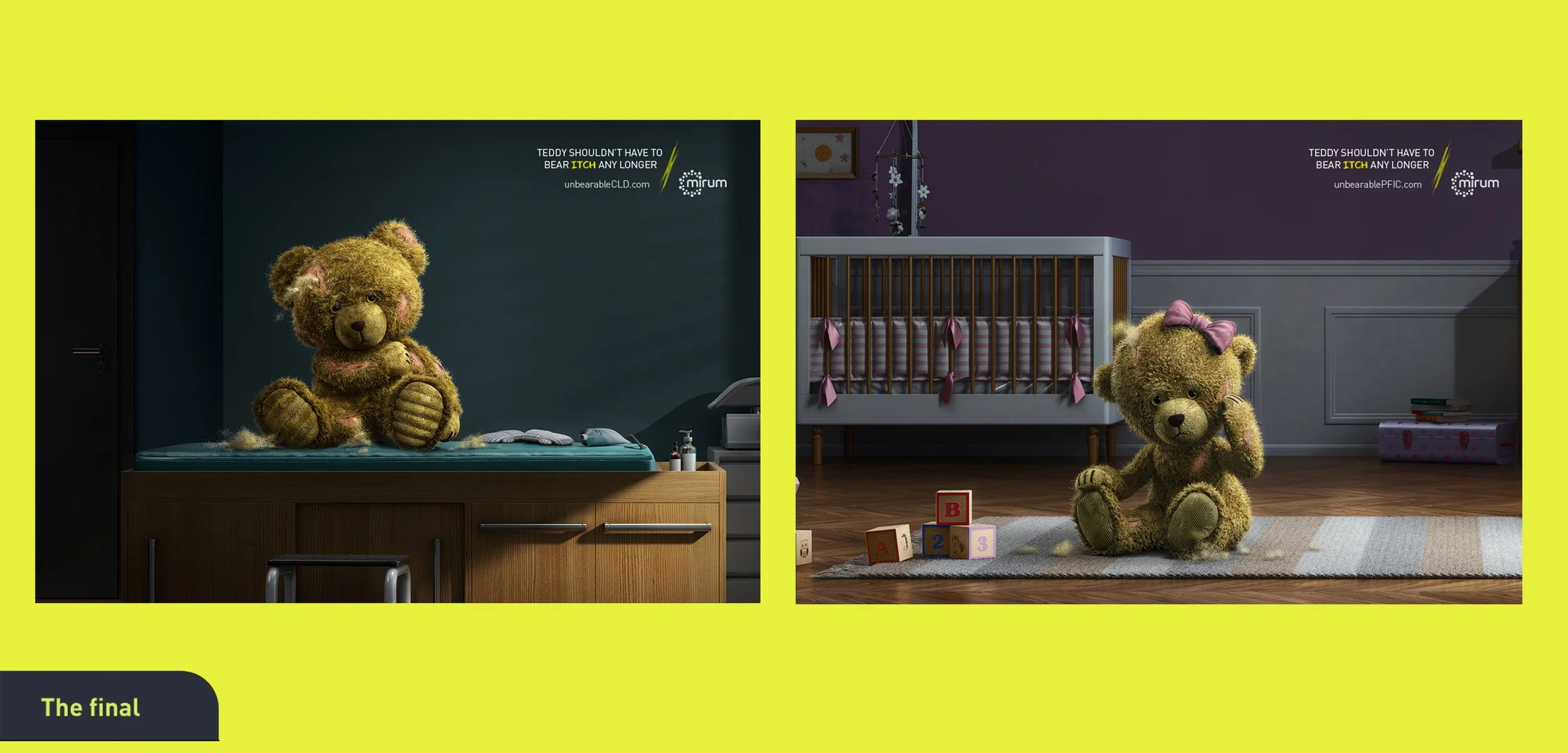 Children with Alagille Syndrome endure an unbearable itch that never lets up. But while the world sees the symptom, it often misses the child behind it. The Unbearable Itch campaign for Mirum Pharmaceuticals set out to change that. Using the beloved teddy bear—once a source of comfort—transformed into a symbol of lost innocence, the campaign reveals how “suffering steals childhood,” urging us all to see beyond the itch and fight for what truly matters.